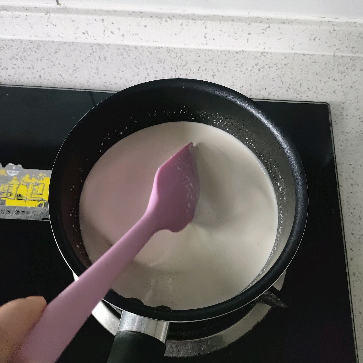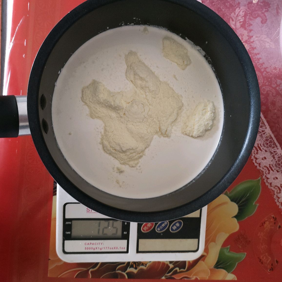 用不粘小奶锅加入以下,牛奶65克,玉米淀粉2.5克,淡奶油50克,炼乳12克(没有炼乳根据自己喜好加入糖,不过炼乳可以增加奶味),奶粉10克