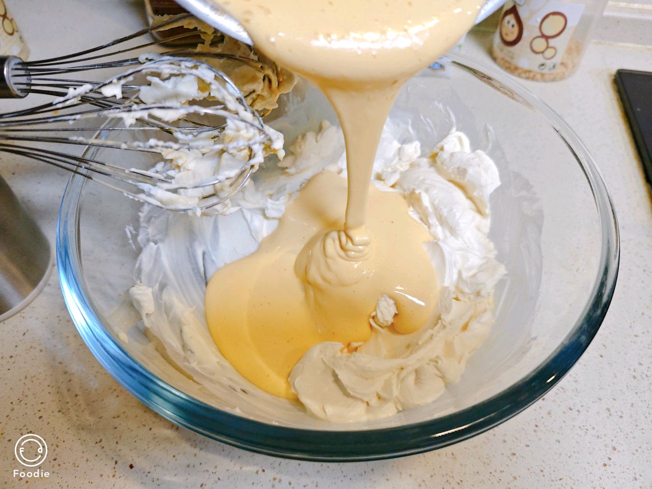慢慢倒入蛋黄中,边倒边快速搅拌,慢倒快搅是避免蛋黄烫成蛋花汤。