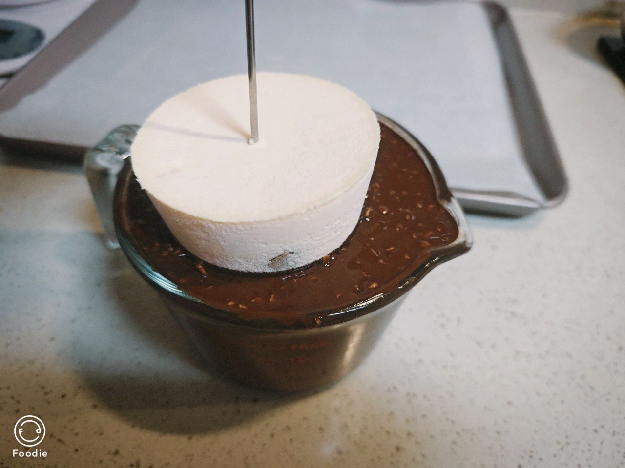 剩下的巧克力液倒入杯盖中,悬转杯盖,均匀铺满,放入冰箱冷冻半小时。