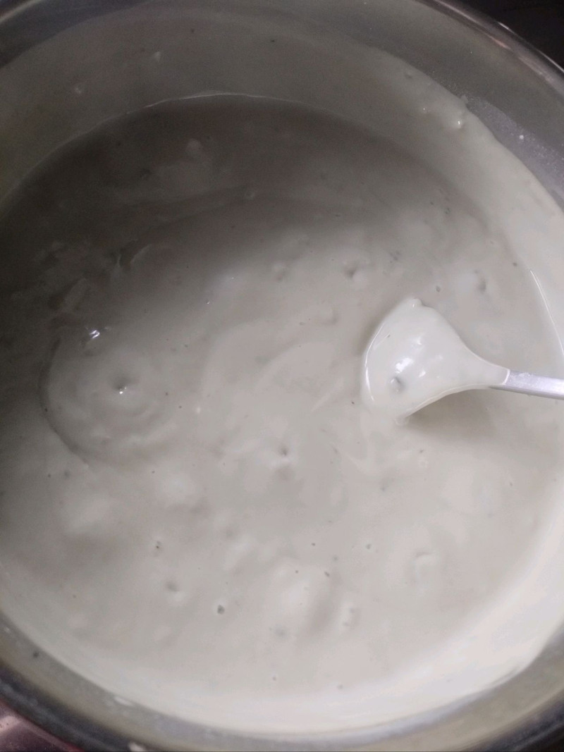 锅里加热,这个过程就几分钟,小火边热边搅拌,热开了差不多3分钟左右,搅拌到手感差不多呈现老酸奶那个粘稠状态就可以了。