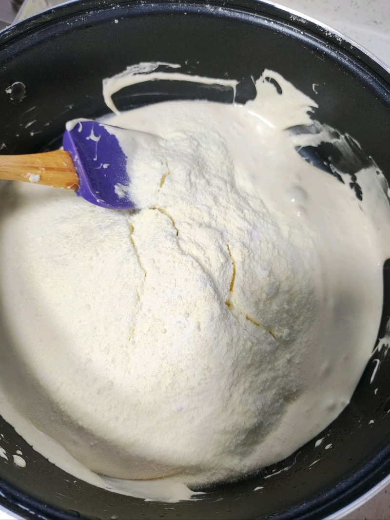 关火,倒入奶粉和椰子粉,翻拌均匀