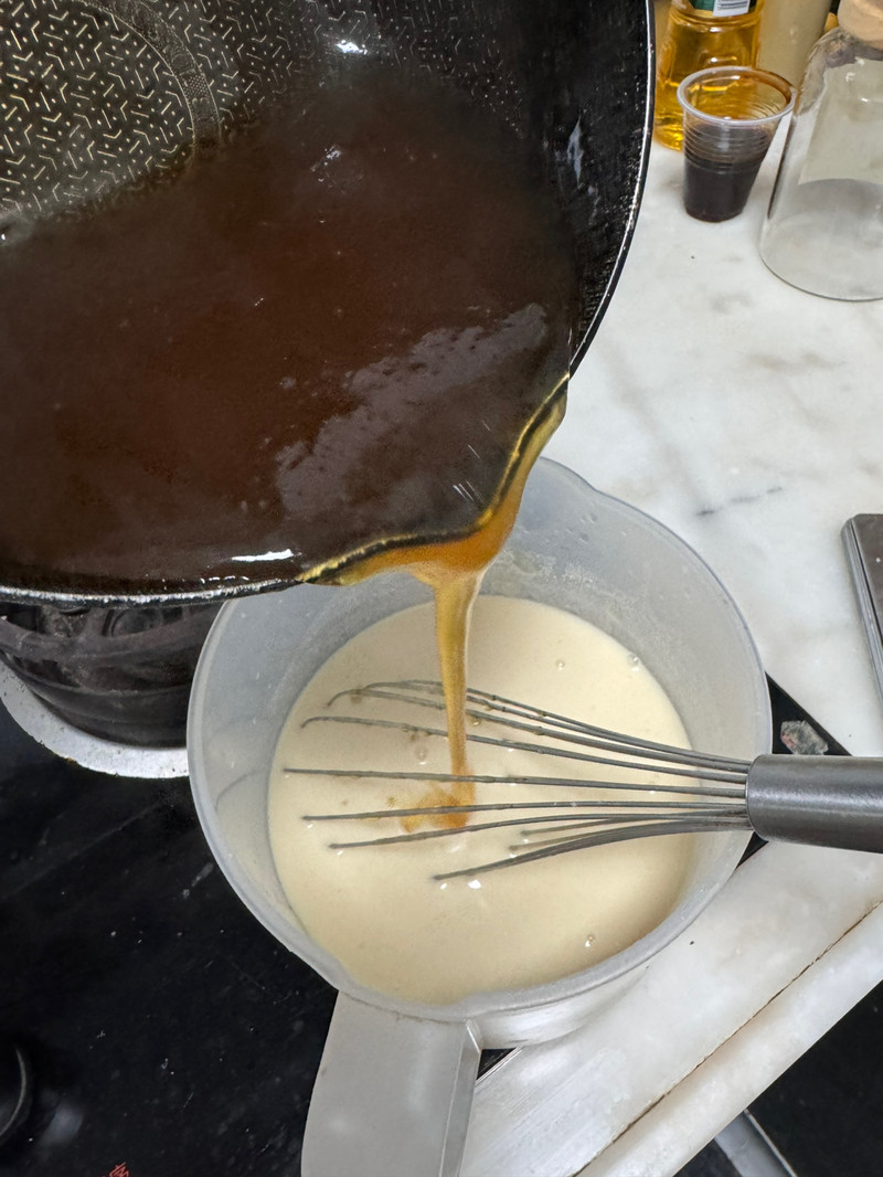 (做黄色层,生熟浆) 将150g马蹄粉,用500克常温水,调成生浆,过筛备用 再准备400克的开水,备用 250克的冰糖,小火,炒至微焦糖色,关火,倒入400克的开水(用锅盖挡着,小心溅伤)。煮开后,关小火 勺一勺马蹄粉浆进去搅拌成微浓稠状态,关火,将这锅熟浆倒入剩下的生浆里面,边倒边搅拌