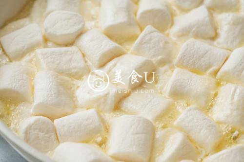 待黄油完全溶化后,加250g棉花糖,小火搅拌至完全融化的状态。