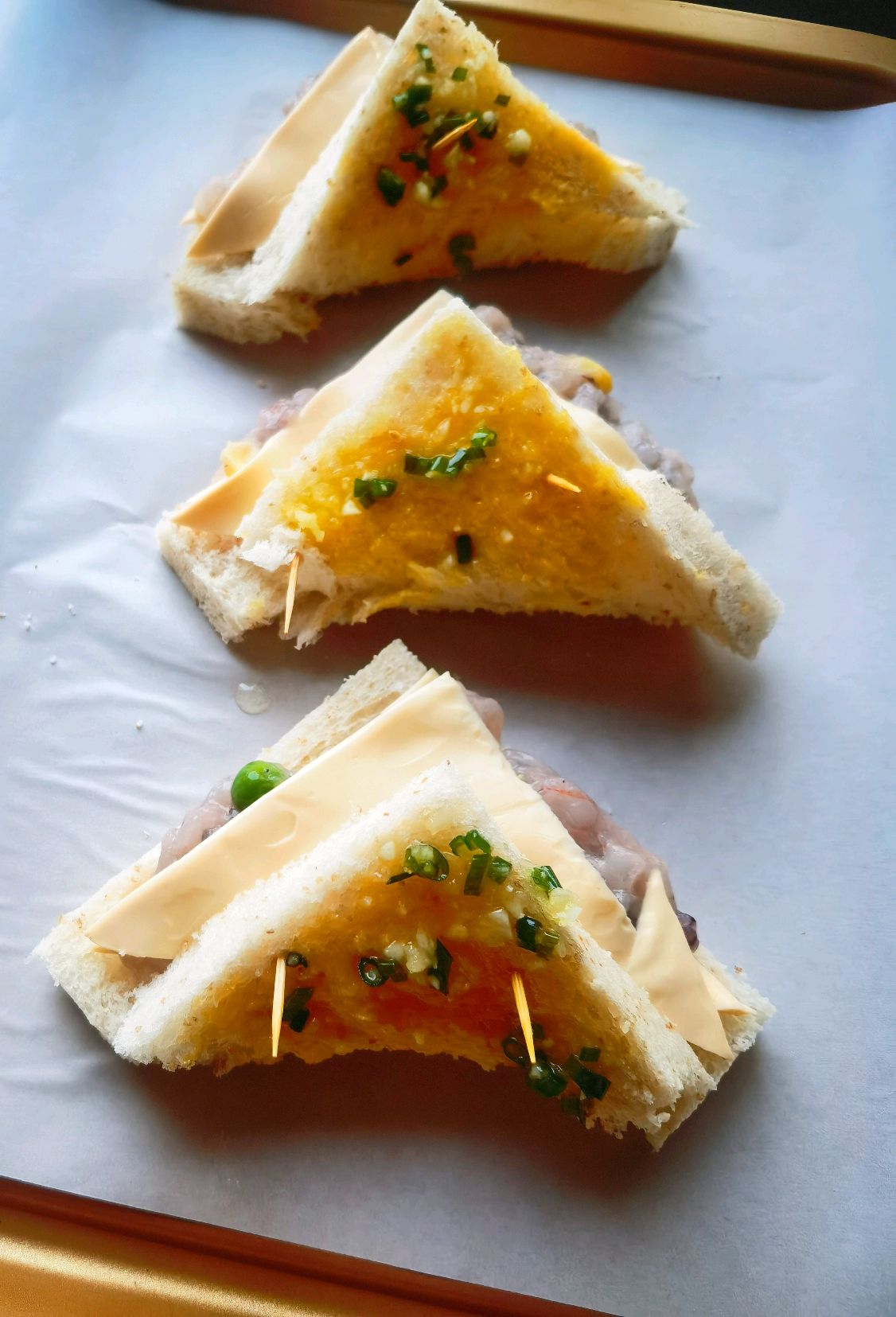 在吐司上面放半片芝士,铺上虾滑,然后再放上半片芝士,对折起来用牙签固定。