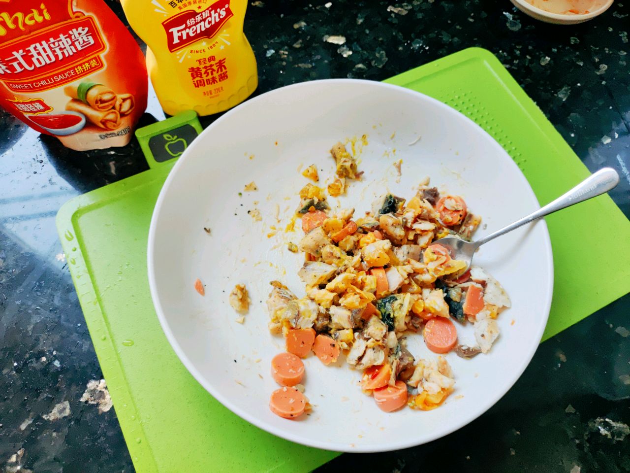 主料:挪威青花鱼半片 米饭一碗 黄芥末酱一小勺 甜辣酱一小勺 黑胡椒海盐一点点 萝卜干少许 海苔碎少许 火腿肠一根