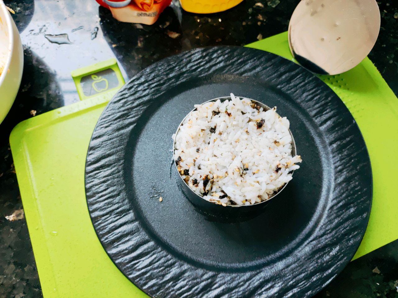 准备一个慕斯圈,里面抹一点油,后面好脱模,放一层米饭,用勺子压一下