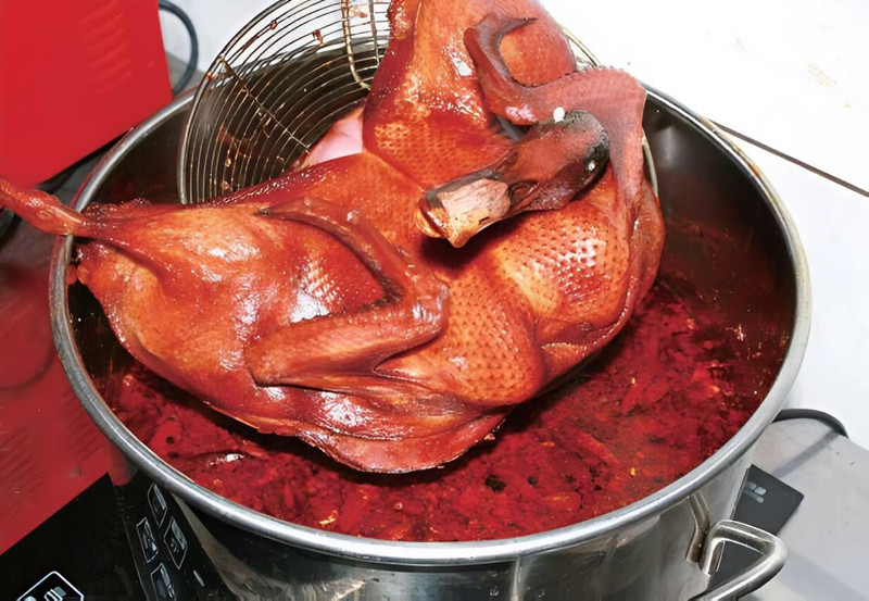 7 放在烧开的香辣卤水里,关掉火并开盖浸卤30分钟。最后把卤好的鸭放在风口处风干,或放进烤炉(开盖)用100℃左右炉温焙至干爽即可。