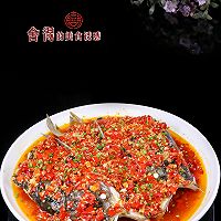 把筷子交叉放入盘中(使鱼头底部受热均匀),再将腌制好的鱼头抖去葱姜汁后放入盘中,倒入适量的啤酒(去腥、嫩、增鲜),倒入适量的蒸鱼豉油,加入适量的鸡精,再淋入少量的色拉油,将炒好的剁辣椒均匀的铺在鱼头上,最后放上适量的姜片、小葱。蒸锅烧水,上大气后放入鱼头,大火蒸十分钟(具体时间因鱼头大小而定),用筷子试插鱼头,筷子能直插盘底即可。