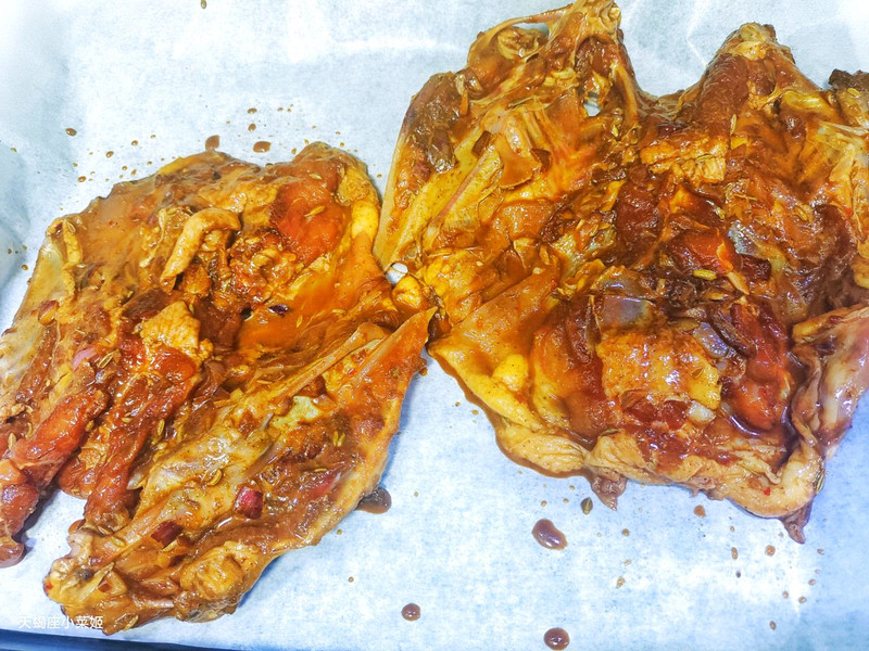 鸡架从中间剪开,去掉内脏,鸡尾多余的肥油,清洗干净,沥干水分份,凸起的骨头部分砍两刀防止烤制时绷起