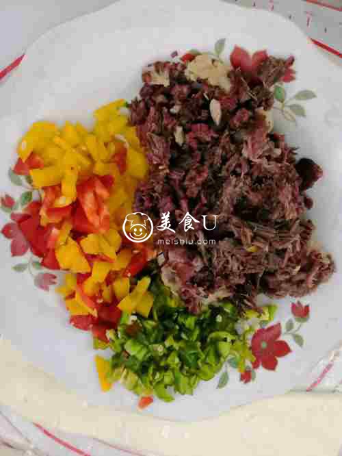 青椒,甜椒切碎备用,把蒸好的驴肉稍微晾凉切碎备用