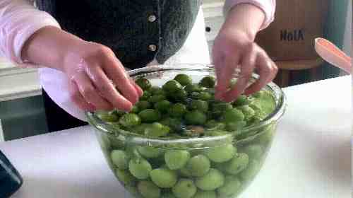 浸泡过程中把果蒂拿掉,每一颗青梅的果蒂都要取出,浸泡后再用清水多洗几遍