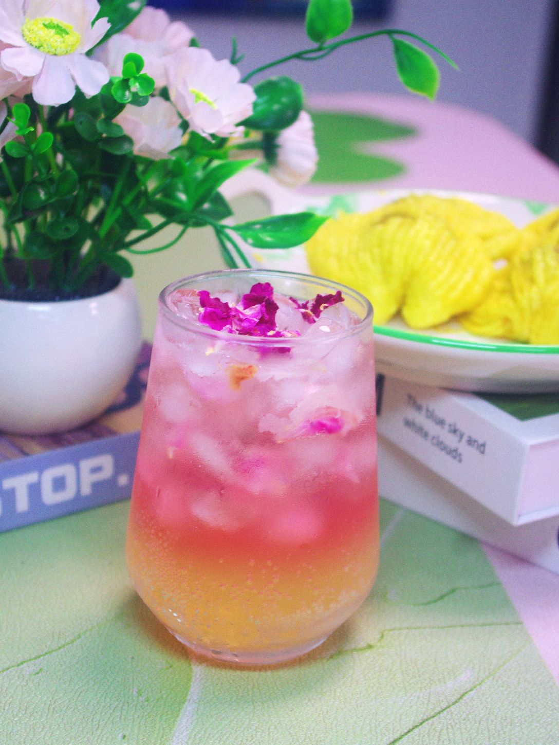 主料:干玫瑰花瓣5克 热开水150克 柠檬VC汽水100ml 冰块适量