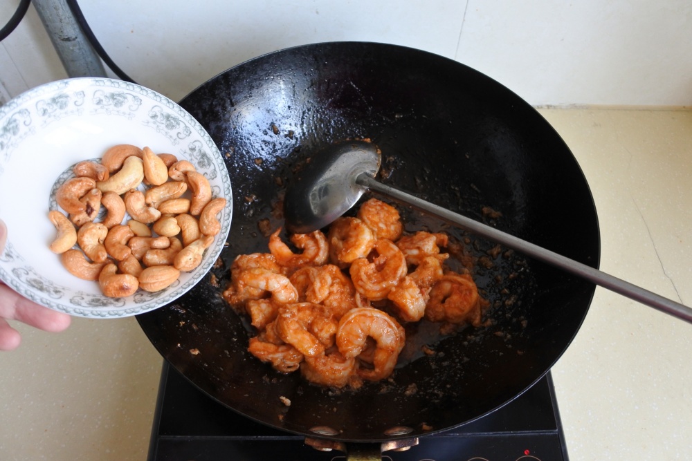 用炒过腰果的油炒虾头和葱姜,直到把虾油全部炒出来变得红彤彤。然后把虾头和葱姜捞出来,扔掉不用