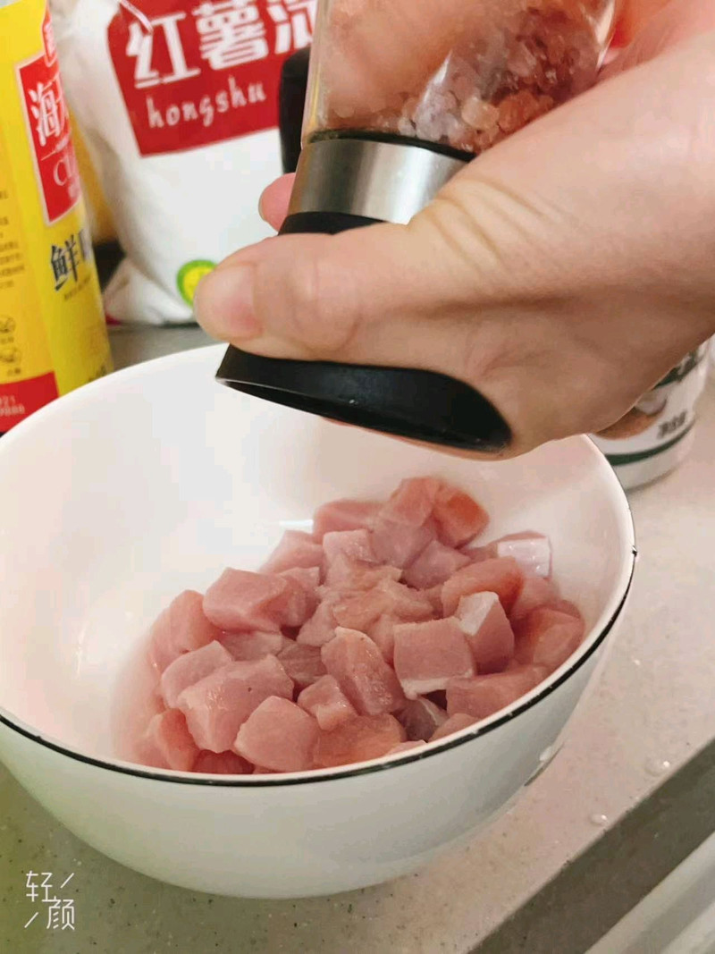 准备食材,肉切丁,一盐,胡椒油,淀粉,糖醋,柠檬,生抽