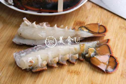 接着用刀把两只大钳子切下来,头部和尾部衔接处扭转一下,把虾尾拆下来。