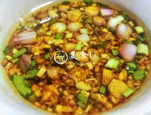 锅内烧油,油热淋在料碗中,再加入少许生抽即可。配上皮爽肉滑的白切鸡,鲜美无比。