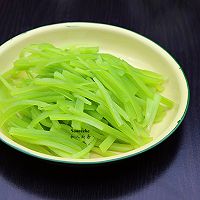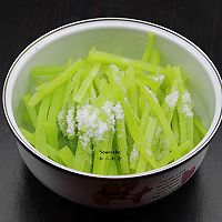 去皮好的莴笋,切丝,用盐腌制3分钟;PS:变软,有盐水即可