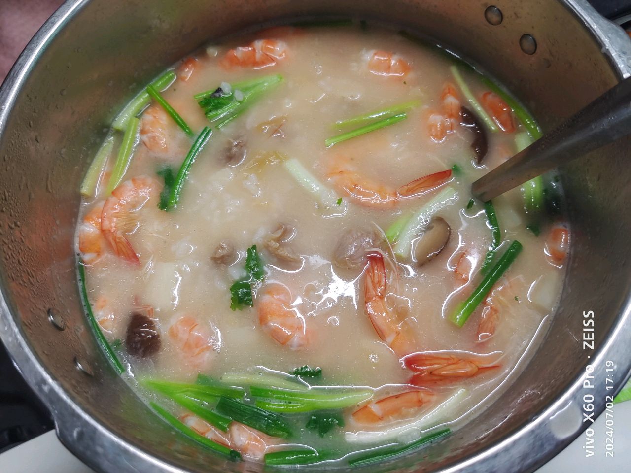 煮到大米七八分熟,下虾跟肉片。大概一两分钟左右