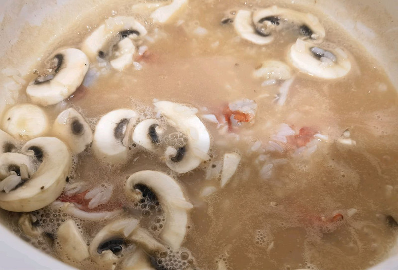 主料:大米适量 黑虎虾适量 口菇5-6个 青菜一把 盐适量 白胡椒适量 葱姜蒜适量